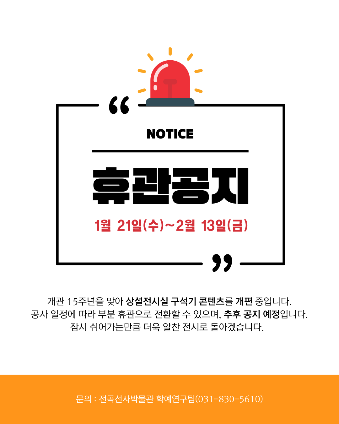상설전시실 개편 공사로 인한 휴관 안내(1/21~2/13)