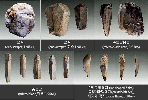 대전 유성구 노은동에서 갱신세 고토양층에서 구석기층을 확인하였다. 유적이 자리 잡은 낮은 구릉지대는 남쪽에는 유성천이, 서북쪽에는 지족천이 감싸고 흐른다. 노은동 유적은 A지역과 B지역(남쪽)으로 나뉘어 조사되었는데, B지역은 A지역보다 넓은 범위로 구석기시대 유적이 조사되었다. 문화층은 갈색토양층인 2층과 첫 번째 쐐기가 발달한 3층인데, 유물은 2층에서 주로 나왔다. 암질은 다양하여 석영·규암·편암· 응회암·화강암·석영반암·천매암·혼펠스 등이 있는데, 혼펠스가 70.7%로 가장 높은 비율을 차지한다. 2층 출토 유물 중에서 특징적인 유물은 좀돌날몸돌과 좀돌날로 이것들은 일정한 범위 내에서 나오고 있는데, 이는 이곳에서 좀돌날 떼기 작업이 중점적으로 이루어졌을 가능성을 암시한다. 잔손질 석기로는 긁개· 밀개·새기개·다기능 석기(밀개+새기개)·톱니날·홈날 등이 있으며, 대형석기로 찍개 한 점이 있다. 이들 가 운데 노은동 유적을 특징짓는 석기는 새기개이다. |