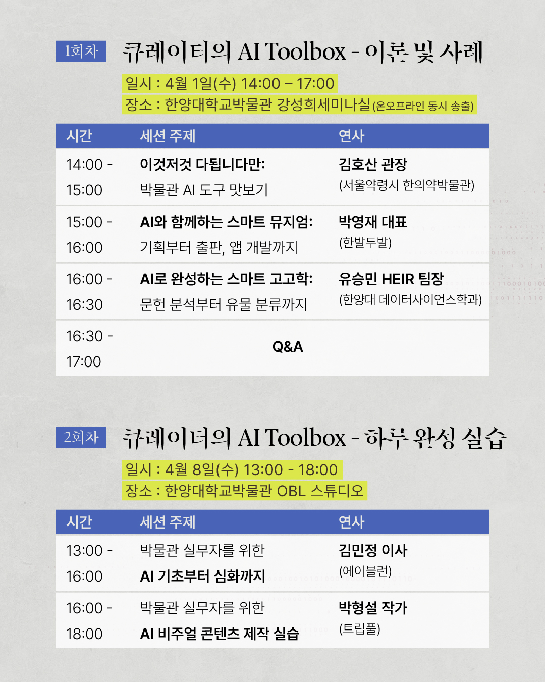 다양한 박물관 AI 도구 맛보기부터 스마트 뮤지엄 기획, 스마트 고고학 사례, 그리고 직접 해보는 비주얼 콘텐츠 제작 실습까지! 실무에 바로 적용할 수 있는 알찬 세션들로 꽉꽉 채웠습니다.